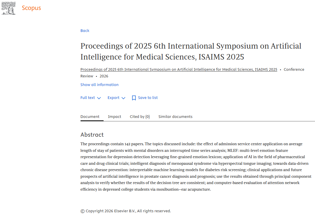 2026 7th International Symposium on Artificial Intelligence for Medical Sciences (ISAIMS 2026) will be held on October 23-25, 2026 in Shanghai, China. ISAIMS is an annual conference that has been held successfully for 6 years and attracted more than 1000 scholars and experts. The mainly covers topics on Frontier technologies of AI, biometrics, intelligent medical robots, intelligent image recognition, intelligent diagnosis and treatment, medical artificial intelligence in the post-epidemic era, etc.